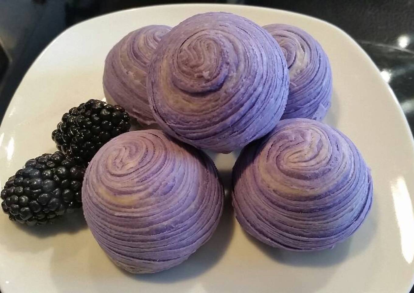 - Cut into half each rolls. Then roll it out. Wrap up with yam filling.