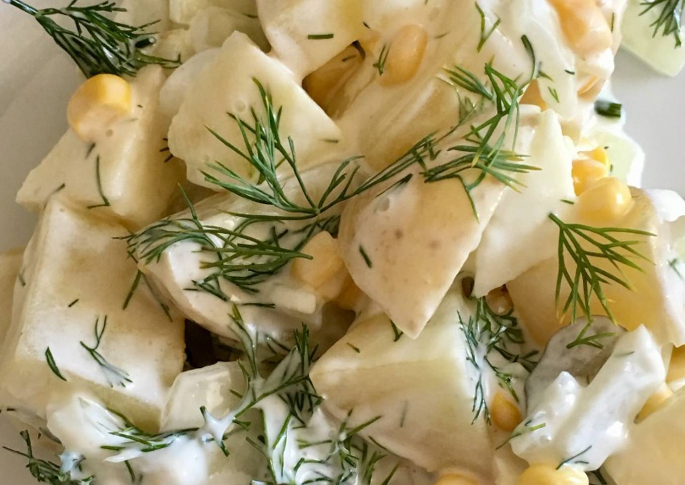 - When potatoes are cool enough, cut into 1/2 inch pieces. Add onions, apples, corn, pickles