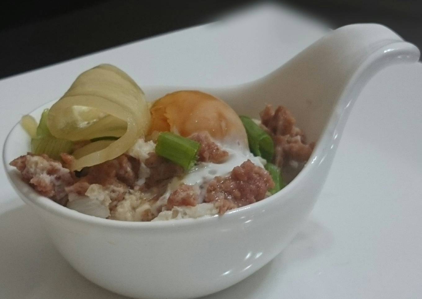 - TO SERVE, steamed spam with salted eggs top prickle ginger and scallion ,great with white rice